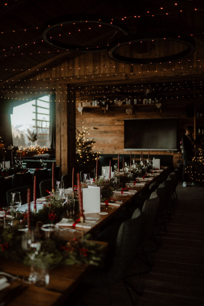 Directly in the Alm there are a large suite with around 160 square meters and four double bedrooms. This is great for the bride and groom and their closest friends. In the valley, about 15 minutes away, there are Two apartment buildings with space for up to 55 people in total. These are part of the location and can be booked flexibly, even for just one or two nights. There are of course other hotels in the valley, but they often require longer minimum stays in winter. It is best to clarify the accommodation issue early on and let your guests know in good time.