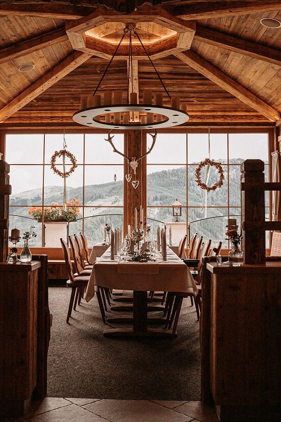 Für die anschließende Feier bietet die Hohe Mut Alm Platz für bis zu 230 Personen. Was ich als Hochzeitsplanerin richtig cool finde: Ihr als Brautpaar bekommt an eurem Hochzeitstag eure eigene Hochzeitsgondel, die euch standesgemäß auf den Berg transportiert.