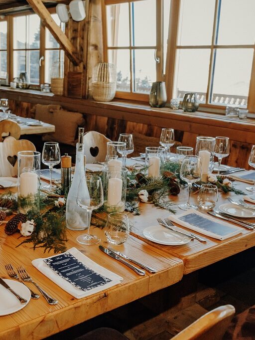 Anders als bei Sommerhochzeiten, wird ein Großteil eurer Feier, unabhängig vom Wetter, bei einer Winterhochzeit drinnen stattfinden. Denn spätestens wenn die Sonne weg ist, wird es draußen bei eurer Hochzeit in den Bergen doch sehr kalt werden. Gerade weil ihr einen Großteil eurer Hochzeit im Innenbereich der Location verbringen werdet, solltet ihr euch in diesem zu 100% wohlfühlen und ihn mindestens genauso schön finden wie den Outdoorbereich.