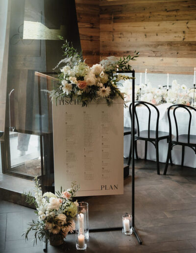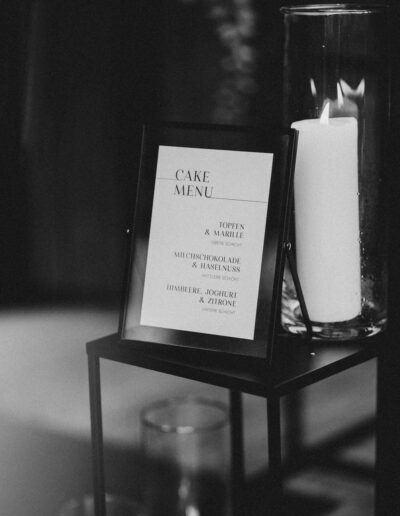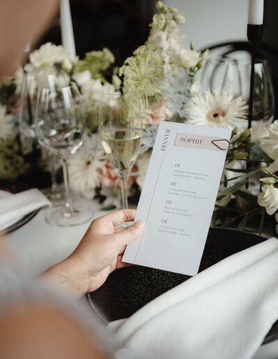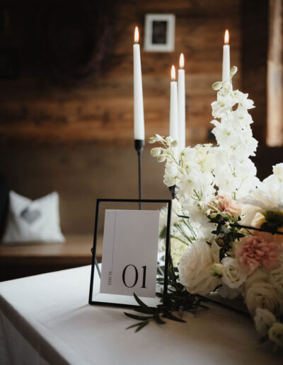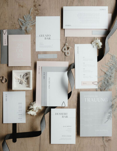 Ein roter Faden zieht sich durch alle Elemente des Hochzeitstags und verleiht dem Konzept eine harmonische Struktur. Von der Save-the-Date-Karte über die Menükarten bis hin zu den Tischnummern – jedes Detail ist stilistisch und farblich perfekt abgestimmt. Hochwertige Materialien, minimalistisches Design und schwarze Akzente verleihen der Papeterie eine elegante Note, die garantiert bei den Gästen für Begeisterung sorgt. Heiraten in den Bergen wird damit zu einem unvergesslichen Erlebnis in einer atemberaubenden Kulisse.
