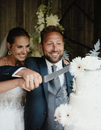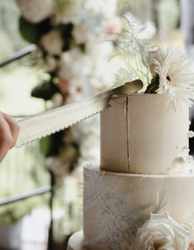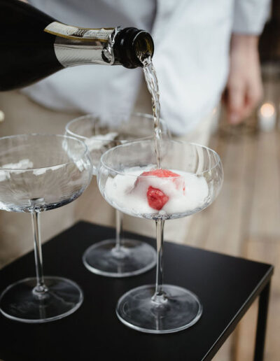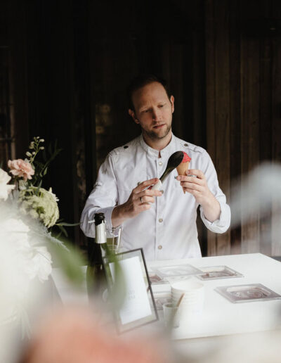 Der Empfang überrascht mit einem besonderen Aperitif: Sorbetkugeln in Champagnerschalen, aufgegossen mit Prosecco, bieten eine erfrischende Abwechslung zu klassischem Sekt. Eine Gelatobar ergänzt das kulinarische Angebot und sorgt besonders an warmen Sommertagen für Begeisterung. Ein Sweet Table mit Petit Fours und Macarons harmoniert perfekt mit der Hochzeitstorte, die mit farblich abgestimmten Blüten dekoriert ist. Diese fügt sich wunderbar ins Gesamtkonzept ein und setzt das Design des Hochzeitstags eindrucksvoll fort.