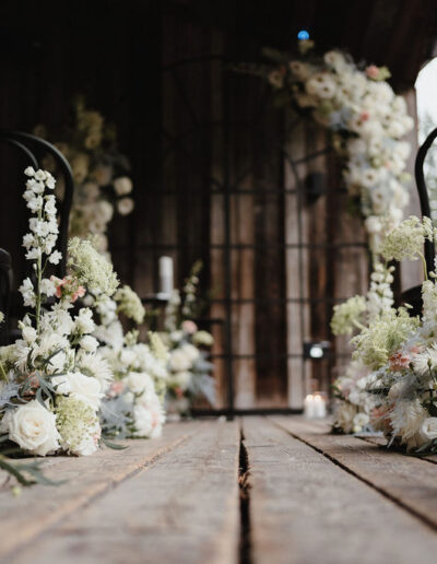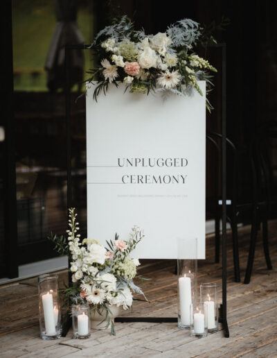 Die Trauzeremonie findet auf der Terrasse der „Deantnerin“ statt und überzeugt mit einer liebevollen Dekoration: Ein üppiger Traubogen, geschmückt mit Blumen in harmonierenden Farben, flankiert von Glaszylindern mit Kerzen und kunstvoll arrangierten Gestecken, sorgt für ein romantisches Ambiente. Jedes Detail ist durchdacht – von Fächern für die Gäste auf den Stühlen bis hin zum stilvoll inszenierten „Unplugged Ceremony“-Schild, das in ein Arrangement aus Kerzen und Blumen integriert ist. An warmen Sommertagen bieten solche kleinen, praktischen Details eine willkommene Abkühlung.