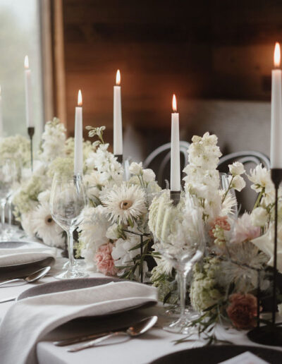 Der Dinnersaal bietet einen Panoramablick auf das teils wolkenverhangene Bergpanorama und schafft damit eine romantische Atmosphäre. Flackernde Kerzen und die stilvolle Tischdekoration mit schwarzen Tellern, locker fallenden Servietten und modernen Blumengestecken sorgen für eine einladende Stimmung, die sowohl gemütlich als auch elegant ist. Solche modernen Details zeigen, wie vielfältig und inspirierend eine moderne Berghochzeit sein kann.